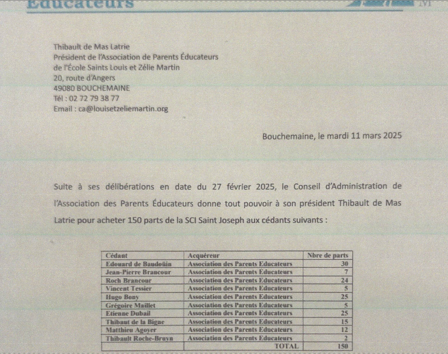 Fait notable, la liste des actionnaires s’est très considérablement réduite lors de l’AG mars 2025. L’Association de Parents Educateurs donne mandat à son président Thibault de Mas Latrie pour racheter 150 parts aux autres actionnaires de la SCI. Désormais les parts se répartissent entre l’héritière de l’abbé Huard (200 parts), un couple qui garde la portion congrue de deux parts, et le gérant (38 parts). L’Association de Parents Educateurs possède désormais 237 parts. La reprise de 150 parts dont la valeur unitaire est de 1000€ souligne la capacité d’une association visiblement fort bien pourvue. C’est à ce moment que, comme d’autres, les époux Brancour se séparent de leurs 24 actions.